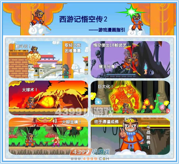 键盘AD键控制移动,J攻击,K跳跃/筋斗云(长按),技能操作:L(火眼金睛)Y(召唤八戒)U(分身术)I(鬼灵邪火)O(豪火球)P(魔化悟空),特殊操作:按两次同一个A/D跑步攻击,长按K(驾驭筋斗云),怒气全满的时候可以按下空格键召唤“齐天大圣的化身”。