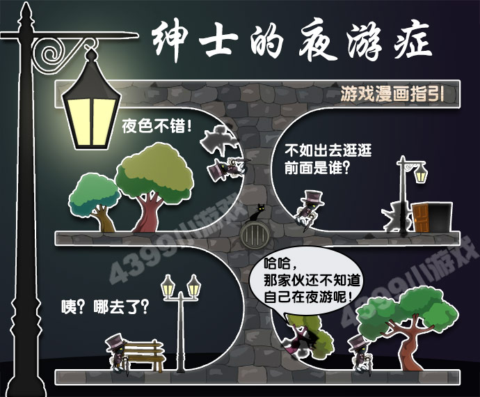 介绍:绅士的夜游症选关版,按1键进入下一关。绅士就是这么一群人,他们通常会手拿文明棍,头戴大礼帽,身着笔挺的西装,足蹬亮皮鞋,任何时间任何地点都表现的彬彬有礼。亚历山大就是一个绅士,可是他平时工作总是鸭梨山大,但是在所有人面前他还要表现得很绅士,无奈之下他只好经常晚上出游以释放压力,在夜晚他不再是那个慢条斯理踱着步的绅士,他是个冒险家,夜幕的黑暗是他最好的掩护,他出发了,我们也跟上他的步伐吧!