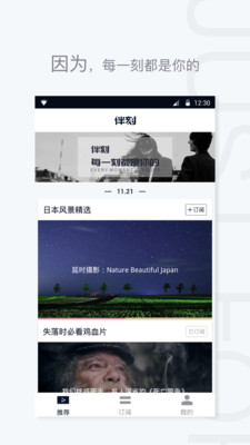 「伴刻」是一款基于兴趣的视频推送工具,你可以使用「伴刻」追踪一个作者或一个主题的动态,毫不费力地获取你最喜欢的视频。用「伴刻」不再错过你喜欢的每一个视频。