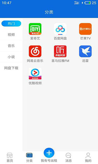 出租猫APP为用户提供了国内各大视频网站、音乐平台、小说平台的VIP账号租用服务,包含了咪咕视频、爱奇艺、优酷视频、芒果TV、迅雷、网易云音乐等等,还有其他类型的账号,小说、视频、音乐、网盘下载等VIP账号都可以在这里轻松的租用;如果您有闲置的视频、音乐、小说等VIP账号,也可以直接发布到平台进行租赁,让帮您可以着这里长期获得更多的租金;为了让用户可以获得更好的账号租用体验,对账号进行了详细的分类,满足许多用户租用VIP账号的需求,需要的用户快来下载使用吧!
