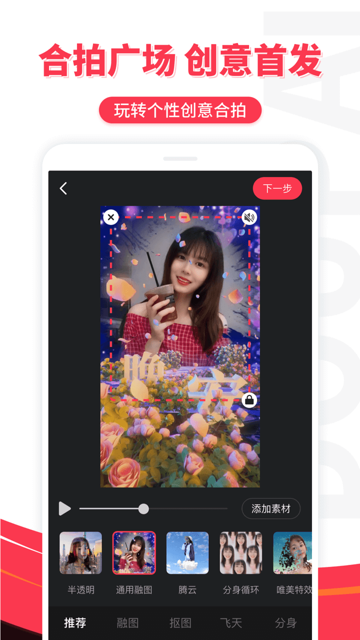 这里的“视频社区”有点不一样,每个人除了可以分享出自己的视频作品之外,还可以与其他作品一起玩转不一样的合拍:半透明合成、唯美融图、趣味抠像、动效组合等等新玩法,给你既简单又有趣的视频制作新体验。