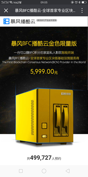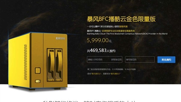 12月8日,暴风集团旗下暴风新影公司推出了一款暴风BFC播酷云(原名播酷云),价格定为5999元,首批2000台5分钟内销售一空。今天开启第二批预约,12月26日公开抢购。