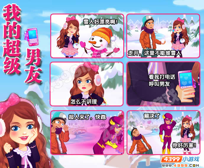 介绍:冬天来了,外面下着很大的雪,白茫茫的一片,女孩来到外面堆雪人,眼看雪人就要堆好了,可是来了一位野蛮的男生将雪人摧毁了。女孩很生气很伤心,她拿起了手中的电话叫自己的男友来帮自己出气,女孩这次叫来的男友会是怎样的呢?让我们到游戏中去瞧瞧。
