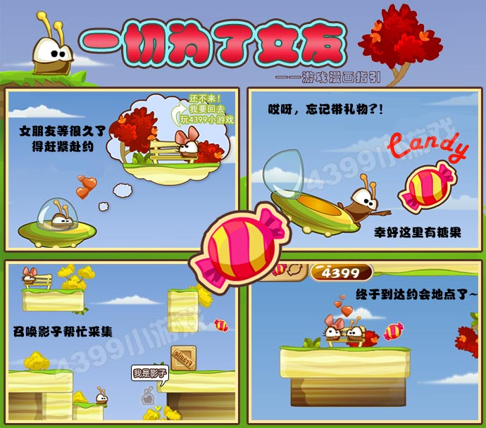 提示:游戏中可以旋转屏幕,让外星小男孩跟自己镜像调换位置吃到糖果和找到女友哦!