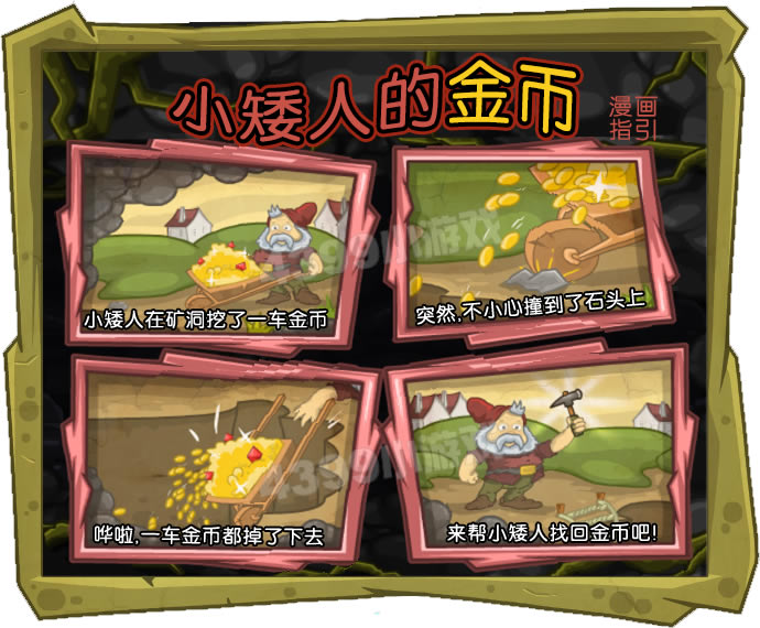介绍:辛勤的小矮人好不容易的将一车金币从矿洞中给挖出来,可是在推回家的路上一个不小心又将它们都搞洒回去原来的矿洞中了。为此,小矮人决定要利用自己的智慧去将那些洒落如矿洞中的金币都捡回来,我们也去帮帮他吧!!