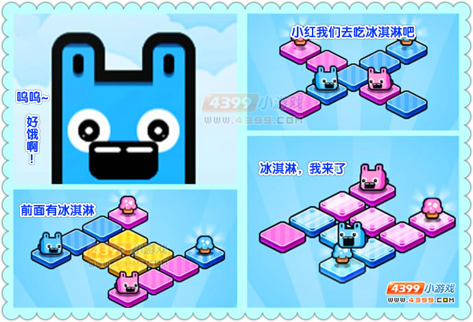 介绍:小兔子吃冰淇淋中文版。小兔子小蓝和小红肚子饿了,它们想吃冰淇淋,小蓝想吃蓝色冰淇淋,小红想吃红色冰淇淋,两种不同颜色的冰淇淋被放在不同的位置,只有通过相应颜色的格子才能到达目的地,看来想要吃到自己喜欢的东西还真不简单,开动脑筋想想吧!如果你喜欢小黑游戏请记住我们http://www.xiaohei.com!~