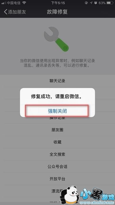 8.耐心等待,恢复完成后点击“强制关闭”,关闭微信重新启动微信;
