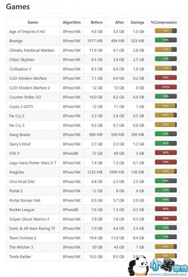 根据Reddit论坛上的网友反映,这个软件对于不同的游戏实际的效果可能会有所不同,有网友总结了自己25个游戏的压缩测试结果,并制作了一张表格。可以看到,压缩率最高的游戏《兽人必须死》达到了48%,但也有根本没法进行压缩的游戏《使命召唤8:现代战争2》,不过这个功能的确会给喜欢囤积游戏的玩家们节约不少空间。