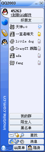 从主界面来看,MSN Messenger 6.0基本没有改变,而QQ2003则新增加了QQ短信和QQ游戏两个按纽,同时增加了QQ邮件提示,这和MSN Messenger的电子邮件提示非常类似。