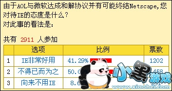 然而从消费者角度看,IE虽然是这场商业竞争的胜者,但它可能还不是一款尽善尽美的产品。赛迪网日前就“AOL、微软和解,消费者如何看待IE”做了一份网络调查,接受调查的1458名网民认为使用IE是“不得已而为之”,占到调查样本的50.35%;有1187名网友认为“IE非常好用”,占到总数的40.99%;另有8.67%的网友,即251人表示“从来不用IE”,这些网友很可能就是AOL Netscape浏览器或者Opera浏览器的用户。