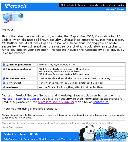 记住,微软从来不会在给客户的MAIL中附带修正补丁的。