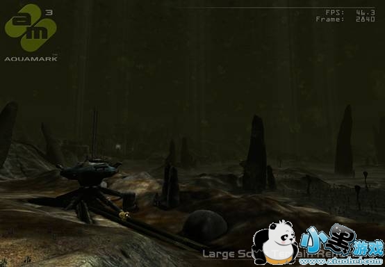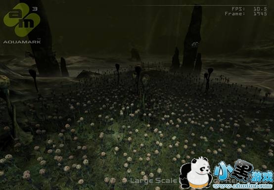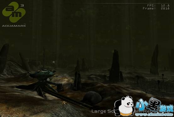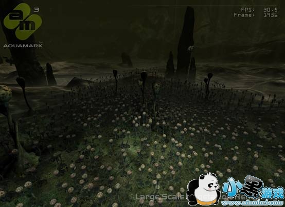 大面积地形渲染描绘了一个可视距离极远,有着不同地面细节和若干灯光效果的海底场景。截图中高度参次的地形体现了Krass游戏引擎可以方便表现连续的离散的地形效果,而且据说地形数据可以被多次重复利用。这个测试在也十分依赖于高端卡的像素渲染。