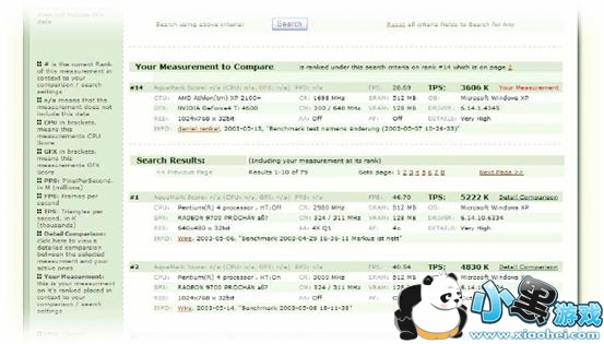 可以设定总成绩、CPU成绩、GPU成绩、帧速度成绩、三角形生成成绩、像素渲染成绩等进行成绩搜索。
