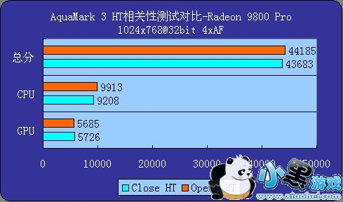 由于AquaMark3特意说明并在设置中内置了超线程支持,所以我们也对其进行了专项测试。从图可以看出,打开超线程后CPU和总分都有提高,但GPU成绩有极轻微下降,但鉴于总分得提高,我们在所有的测试中都打开了超线程技术支持。