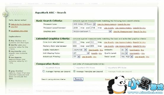 [全球成绩公告板,AquaMark3 ARC系统] 我们前文提到过,AquaMark3有一个特点是免费版也可以使用的全球成绩公告板。即AquaMark3 ARC系统,意为:AquaMark、Result、Camparator。它的使用也分为三步,观看管理自己的成绩,搜索其它人公布的成绩,进行各种条件的成绩比较。在左边还有使用向导。