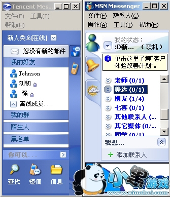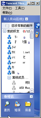 从上图我们可以看出,两者有着惊人的相似,无论是整体的布局,功能按钮的分布,还有色调,甚至连头像都使用了类似Msn Message 的方式。两者都是首先工具栏,接着是当前用户的登陆状态(可以和Msn Message 一样点击选择离线等状态),邮件的接收情况,在线的好友和分组(TM这里虽然也模仿MSN Message ,但也继承了QQ的一点特色),再接下来的TM"你可以相当于Msn Message 的"我想.." 。最后的区别是,TM最下层是"查找"、"短信、"信息",而微软则是卖广告的横幅,虽然好象有点区别,但最终目的都是为了赚钱:"短信" 等同于 "广告" 。