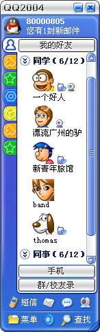 个性化主面板 QQ 2004主面板独到的设计风格给人以强烈的视觉效果。据说此次用户界面设计的主题是 扩展性和定制性,在主面板和聊天窗口,很多东西的显示与否都可以定制,界面简单还是酷炫就完全由你说了算哦!^_^大家还是先睹为快啦~~