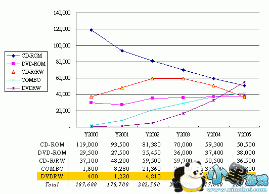 通过这个图表我们可以很直观的看到DVD刻录机强劲的增长势头,也可以明显看到随着时间的推移,传统的光储产品已经开始渐渐被淘汰。而近期火了一阵的Combo的增长速度也开始趋缓。所以我们完全有理由相信,如果仍然固守CD的阵地,势必会在不远的将来,发生与其他人交换数据而出现不便的状况。