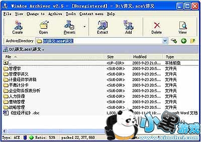 提到WinACE可能知道的人就不如上面两个软件多了。但国内还是有相当的支持者,所以笔者也把他放到被测软件之列。这个界面朴素功能强大的压缩软件也有自己专用的文件格式--ACE。这个软件最大的特点是压缩率高,可以说是主流压缩软件中压缩比最高的。