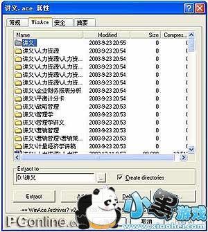 在很多情况下,文件的右键属性提供了一种快速了解文件情况的方式。在三款软件中,这方面设计的最好的要算WinACE了。在ACE文件的属性页面中,除了普通文件的“常规”、“摘要”等属性标签外,还增加了一个“WinACE”标签页。在这个标签中,我们不仅可以了解到压缩文件中所包含的文件,而且还可以直接对压缩文件进行解压缩,文件添加,文件删除等操作。而WinRAR的属性页中则提供了一个压缩比例图,可以让你十分直观的了解到压缩文件的压缩比情况。最差劲的就是WinZIP了,属性页中别无它物。