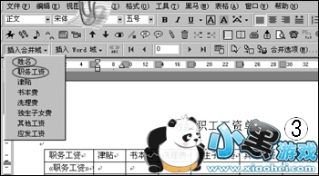 4.把光标置于要插入相应项目的位置,点击“插入合并域”下拉菜单(下拉菜单中的相应选项与“x月工资.xls”表格中的标题行是一一对应的),然后单击下拉菜单中的相应选项,直至操作完毕(如图3)。