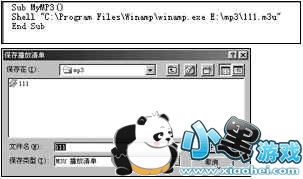 第二步:在“代码”窗口中的“Sub MyMp3 ()”与“End Sub”两行之间输入一行内容:“Shell "C:\Program Files\Winamp\winamp.exe E:\ mp3\111.m3u"”。其中“C:\ Program Files德镇\ Winamp\winamp.exe”为MP3播放器Winamp的路径及程序名,“E:\ mp3\111.m3u”是预先设置好的MP3播放清单文件(选择MP3播放器上“清单”项,再点击[保存],在“保存播放清单”中定好文件名即可)(如图1)。