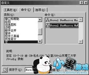 第四步:接下来我们就为这个“宏”来创建菜单命令。用鼠标打开菜单项的[工具]→[自定义],在弹出的自定义对话框中点“命令”选项卡,在“类别”列表框中选择“宏”,在右边的“命令”列表框中你会找到一个名为“Normal.NewMacros.MyMp3”的宏命令(如图2),用鼠标把它拖、放到菜单栏中或快捷工具栏中的合适位置,紧接着再用右键点击该菜单命令,在弹出快捷菜单中的“命名”框中将“Normal.NewMacros.MyMp3”重命名为“我的MP3”回车,再“关闭”即可。
