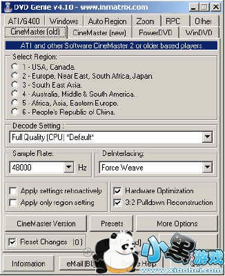 除了可以消除区码限制外,DVD Genie还可以对播放器的软解压性能,进行适当优化,以便能更好地提高DVD光碟的播放效果。选中“CineMaster(old)”标签,打开如图3所示的优化设置窗口,在“decode setting”设置项处,你可以将“katmai enhanced full quality(cpu)”选项选中,这样就可以有效改善光碟播放的质量,不过该功能需要你的处理器足够快才可以。当然,在“deinterlacing”下拉列表中,选中“force weave”选项,也能改善图像的播放显示质量,不过这样会降低光碟播放速度的;因此,没有特殊要求,笔者建议各位将该参数设置为“smart detect”。