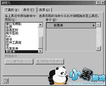 打开Excel XP(在Excel2000下也行,本文以XP系统为例),右击工具栏,从弹出的快捷菜单中选择“自定义”命令,弹出的“自定义”对话框。单击“命令”选项卡,在 “类别”命令中选择“新菜单”,再将“命令”中的“新菜单”拖放到菜单栏中(如图2)。