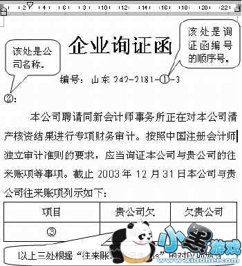 为了叙述清楚,我们假设询证函的格式如图2所示(实际的询证函长达3页,编号中的最后一位数字即表示该询证函有3页内容),该文件名称为“询证函.doc”。在这张询证函中有5处内容取自“往来账项明细表.xls”,即图2中标注的①、②、③、④、⑤处。