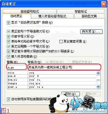 执行“工具→自动更正选项”命令,打开“自动更正”对话框(如图1),切换到“自动更正”标签下(通常是默认标签)在“替换”下面的方框中输入一个便于理解的字母组合(如“yjgs”),在“替换为”下面的方框中输入“某省某市第一建筑安装工程公司”,按“确定”按钮返回。