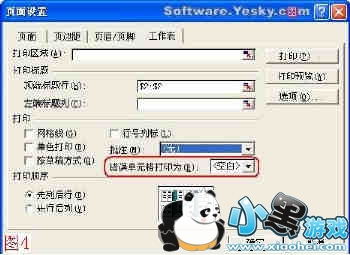 执行“文件→页面设置”命令,打开“页面设置”对话框(如图4),切换到“工作表”标签下,按“错误单元格打印为”右侧的下拉按钮,在随后出现的下拉列表中,选择“空白”选项,确定返回,再打印即可。