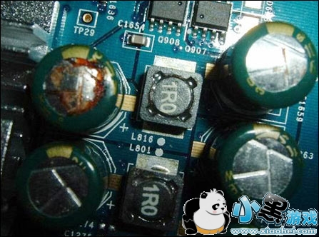 如果说上面那张显卡上的插件铝电解液电容爆浆是个体现象。那么下图这张SMT 安装的OSCON电容爆浆就可能是集体现象了。因为SMT电容在安装过程中是不会有个别电容极性被安装反了的错误而是整批显卡的那棵电容都会安装错误。可能是显卡在交付工厂生产时,线路图上某个电容的正负极标错了,而OSCON电容可以短时间承受极性相反的错误,所以QC检查不出来。不过这样麻烦比上一个更大,据笔者了解这批显卡整批都有问题已全部翻修。