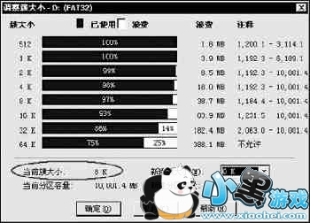 很多磁盘工具都具备磁盘信息显示等功能。例如在PQ Magic中,选择要查看的磁盘分区,然后单击右键选择“高级→调整簇大小”功能,即可从显示的对话框中可以看到该磁盘当前设置的簇大小,如图所示。