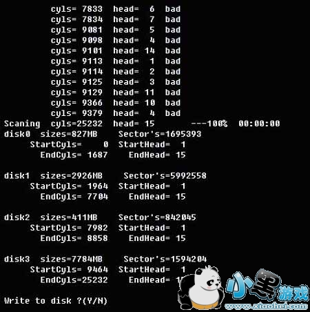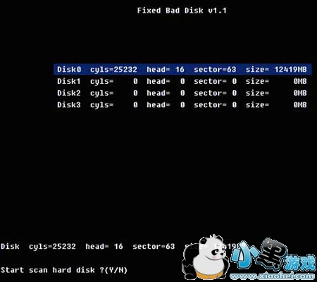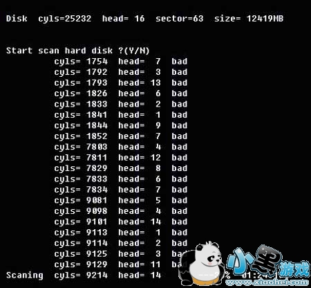 选择你要修复的硬盘并按回车确认后软件提示“Start scan hard disk ?(Y/N)”,按Y程序就开始对硬盘进行扫描。扫描时发现的坏道的位置将会被一一列出在屏幕上(如图02所示),而下方则显示扫描进行的百分比以及剩余时间。