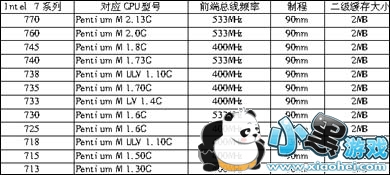Intel最高端的7系列处理器主要对应的是Dothan核心的PentiumM处理器,面向笔记本市场,大家不必太过于关注。只要购买笔记本的时候看清楚配置单即可。详细规格见表三。