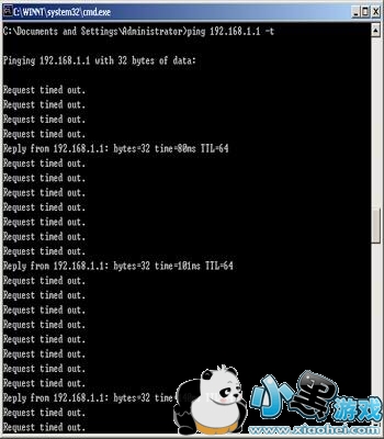 2.出现网络中断后,此时在PC机上ping ADSL Modem网关(192.168.1.1),表现为大量丢包或完全不通。如下图所示: