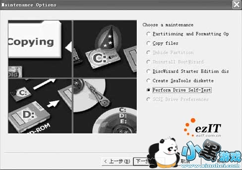 对我们来说当然是选择“Maintenance”,进入图3窗口,“Create SeaTools diske-tte”可以创建一张诊断盘,这张诊断盘包括一个能启动的Ontrack操作系统,引导时会自动进入SeaTools的操作界面,然后我们就可以对希捷硬盘进行全面检测,不过需要说明的是检测时仅针对FAT结构,可以查出FAT类型分区的相关问题,但不适用于NTFS及HPFS结构。“Perform Drive Self-Test”可以进行磁盘测试和错误检测,例如“Return S.M.A.R.T Status”、“Run Short Drive Self Test”、“Run Extended Drive Self Test”等测试,值得说明的是这些功能同样可以在非希捷的硬盘上使用。