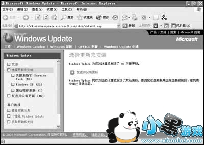 系统的“开始”菜单上,会有“Windows Update”的链接,选择后,进入Microsoft的升级主页,网站上的程序会自动扫描当前系统存在哪些漏洞,哪些需要升级,根据“向导”即可完成,如图所示(笔者推崇这种方式)。