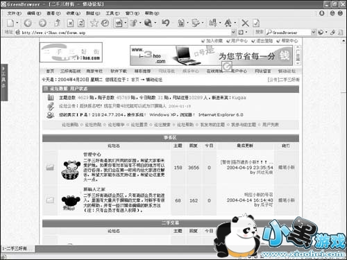由于Green Browser采用的是IE的内核,所以必须电脑中有IE浏览器才能正常使用。Green Browser的外观非常漂亮,外观和按钮采用的都是Windows XP的界面风格(如图1所示)。并且你还可以在Green Browser的官方网站下载更多的皮肤,可以随时对外观进行变换。