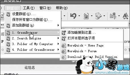 在Green Browser中提供了很方便的群组功能,你可以将若干的网址保存为一个群组,并通过一次点击打开它们(如图3所示)。如果你不需要打开群组中的某个子项,可以在设置框中反选它。你可以为每个群组子项设置个性化的下载控制方案,设置是否在群组菜单中显示群组子项菜单。而且还可以通过拖动一个子项到其他群组来移动它,如果你只需要复制这个子项,就在拖动的同时按下Ctrl键即可。