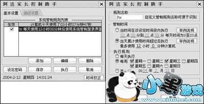 安装并运行“阿达家长控制助手”,会弹出软件设置界面,并在任务栏出现一个小图标。在基本设置中(图1),你可以添加、编辑或删除管制规则。管制规则分为“管制时间”、“执行规则”、“管制任务”三项。在“管制时间”中,可以设定在一天内执行管制任务的具体时刻或时间长度;