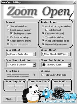 我们常常会借助一些软件来扮靓我们的桌面,从视觉上给我们以美的享受,从而让一些原本机械、枯燥的操作过程也充满乐趣。这里要介绍的Zoom Open,是一款能够为我们开启和关闭应用程序窗口时带来乐趣的软件。用户可以通过它设定一些颇具个性的缩放特效,让窗口在开启和关闭时都会以缩放特效的形式进行,就像一些幻灯片切换中应用到的视觉效果一样,使桌面上的窗口操作生动有趣。
