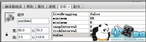 7、给这个Slider组件取一个实例名称"sizeSlider",添加下面的设置。