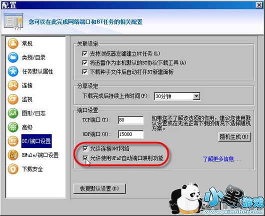 选择“工具”→“配置”,然后单击左侧的“BT/端口设置”项,再在右侧中选中“允许连接DHT网络”复选框(也如上图1)。