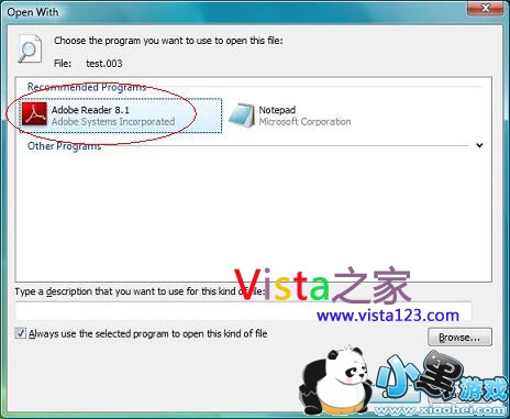 我们知道,未知文件格式的文件会显示成一张白纸一样的东西,每当双击此类文件时,系统会弹出打开方式对话框,而如果你之前误用某程序打开了这个文件,那该程序就会出现在打开方式的程序列表中。比如,新建一个文件,名为,test.003,用Adobe Reader打开一次,此后每次双击此文件都会出现下面的对话框。那么,怎么去掉呢?