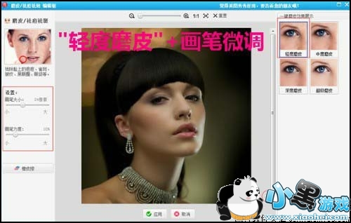因为人物本身的皮肤不太好,为了最后效果更完美,可以先试试磨皮。在对人物皮肤进行磨皮处理时,不用过多的考虑皮肤的纹理和质感,稍磨过一些效果更好。这里我们之所以采用轻度磨皮再加画笔微调,而不是直接一键“超级磨皮”,是为了达到既使皮肤十分光滑又能很好的保持了头发的纹理。