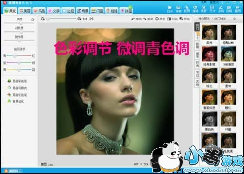 对图片稍微进行下色彩调节,稍稍提高青色调,使得图片的背景偏青绿色。