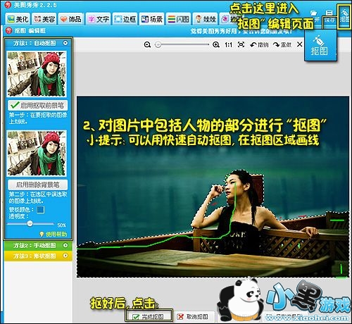 2、接着利用软件右上角的“抠图”按钮,进入抠图编辑框。在“自动抠图”下,对需要抠出的人物部分划“绿线”,即可自动抠出选区(如图4中虚线内的区域)。当然由于背景复杂,有些边缘区域不需要的地方可以用“红线”划掉。
