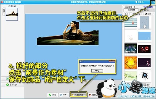 3、完成抠图后界面会跳转到如下图5的编辑框,点击界面下方的“前景作为素材”按钮,即可将抠好的人物作为素材保存到饰品“用户自定义”下。然后不要进行其他处理,直接将这个界面关掉。